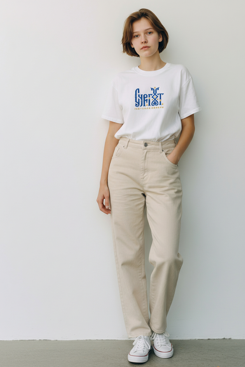 Футболка представлена в глубоком тёмно-синем цвете. Этот оттенок не случаен: он символизирует стабильность, надежность, мудрость, авторитет и глубину. Тёмно-синий цвет прекрасно гармонирует с мощным посланием вышивки, ассоциируясь с бескрайними просторами северного неба в сумерках или глубокими водами сибирских рек. Он подчеркивает серьезность и значимость дизайна, придавая изделию элегантность и универсальность, легко сочетаясь как с повседневными, так и с более официальными элементами гардероба.