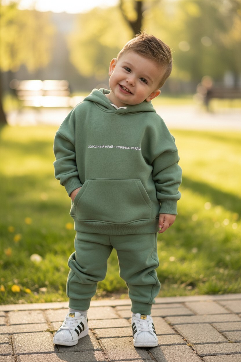 Это худи создано с учётом потребностей активных детей: тёплая внутренняя сторона с начёсом дарит комфорт в прохладную погоду, а прочная трикотажная внешняя поверхность выдерживает частые движения и стирки. Нежный хаки‑тон универсален и легко сочетается с джоггерами, джинсами или утеплёнными брюками. Контрастная белая вышивка «Холодный край — горячее сердце» на груди смотрится аккуратно и не теряет форму со временем — вышивка устойчива к стиркам и активной носке.