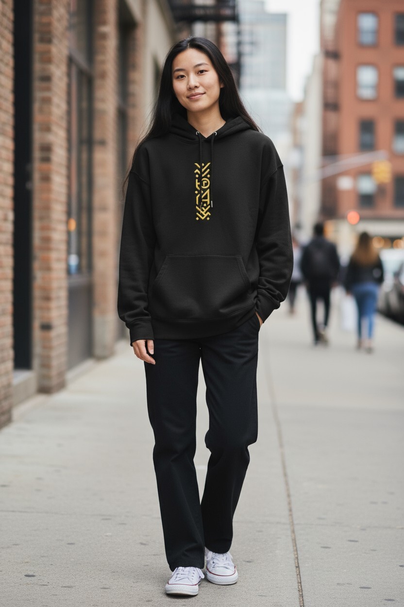 Классический черный цвет худи — это идеальный фон для столь значимой надписи. Черный символизирует глубину, элегантность, таинственность ночной тайги и несгибаемую силу земли. Он универсален, практичен и всегда выглядит стильно, позволяя надписи "Югра", выполненной сибирской вязью, эффектно выделяться, подчеркивая ее важность и особый характер.
