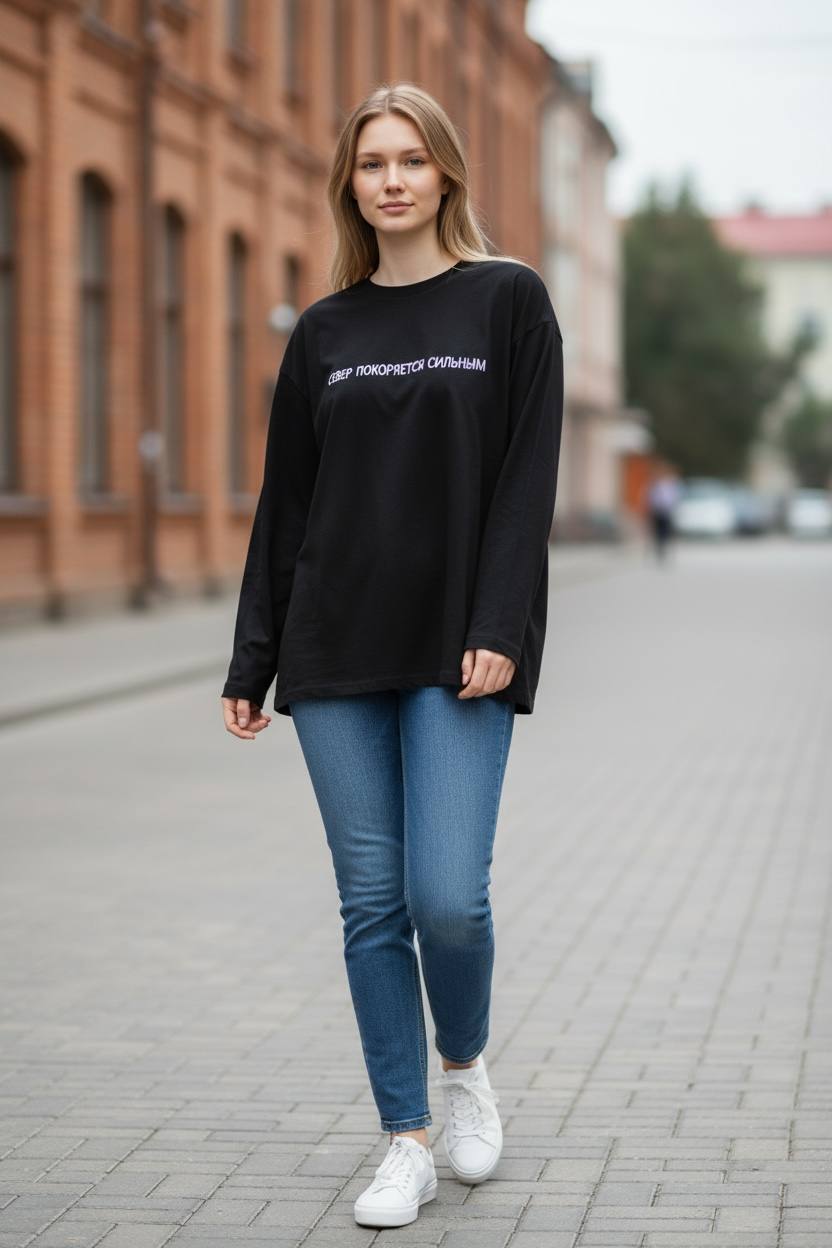 Выразите свою внутреннюю силу и непоколебимую уверенность с нашим новым лонгсливом "Север покоряется сильным". Это не просто одежда, а символ вашего характера, отражение готовности к любым вызовам и стремления к покорению новых вершин.