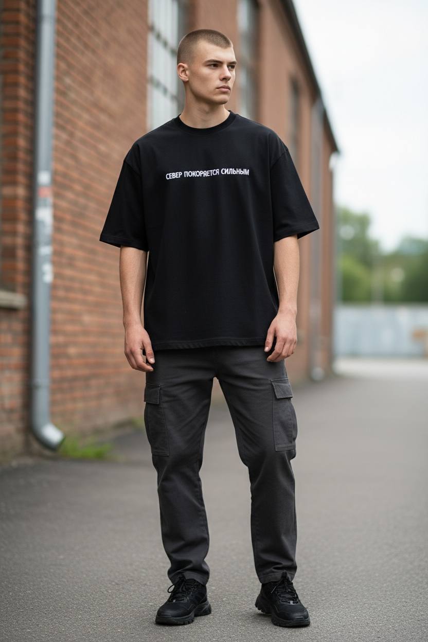 Идеальное сочетание стиля и смысла! Представляем оверсайз-футболку, которая станет центральным элементом вашего образа. Ее главная изюминка – смелая и мотивирующая надпись "Север покоряется сильным", выполненная в контрастном цвете, привлекающая взгляды и транслирующая вашу жизненную позицию.
