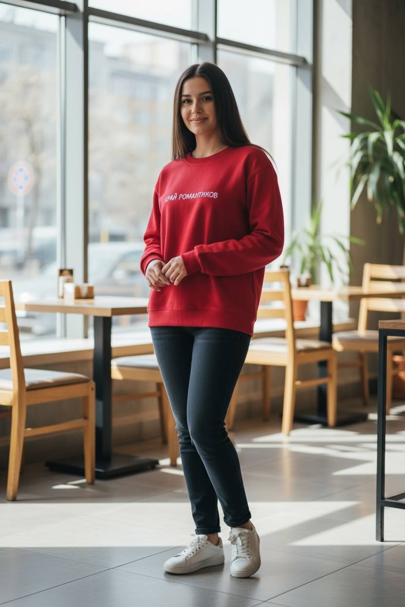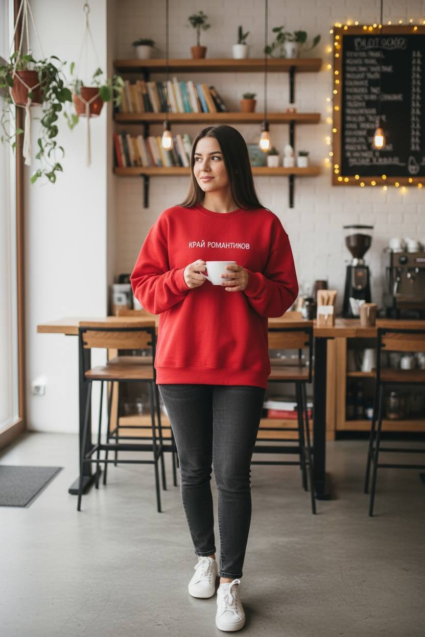 Покажите миру свою романтичную натуру! Этот ярко-красный свитшот с атмосферной надписью «Край романтиков» станет не просто элементом гардероба, а манифестом настроения. Идеальный выбор для тех, кто ищет комфорт, тепло и выразительный стиль.