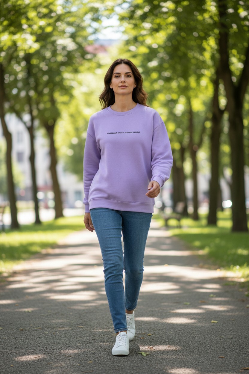 Этот свитшот выполнен из плотного футера с мягким начёсом, обеспечивающего комфорт и хорошую термоизоляцию. Нежный лавандовый оттенок придаёт вещи свежесть и женственность или служит мягким акцентом в мужских луках, а аккуратная вышивка слогана «Холодный край — горячее сердце» делает изделие выразительным и долговечным — вышивка сохраняет свою структуру и цвет при регулярной носке.
