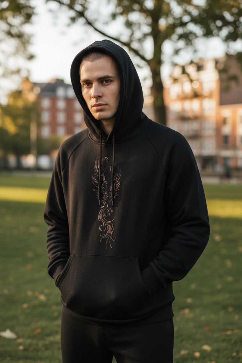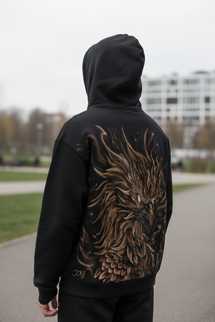 1. Эксклюзивный дизайн Жар-птицы: Изображение мифической Жар-птицы на спине худи создано вручную, по авторской методике. Этот огненный символ свободы и красоты буквально "выступает" из черного хлопка, делая каждый экземпляр абсолютно уникальным.