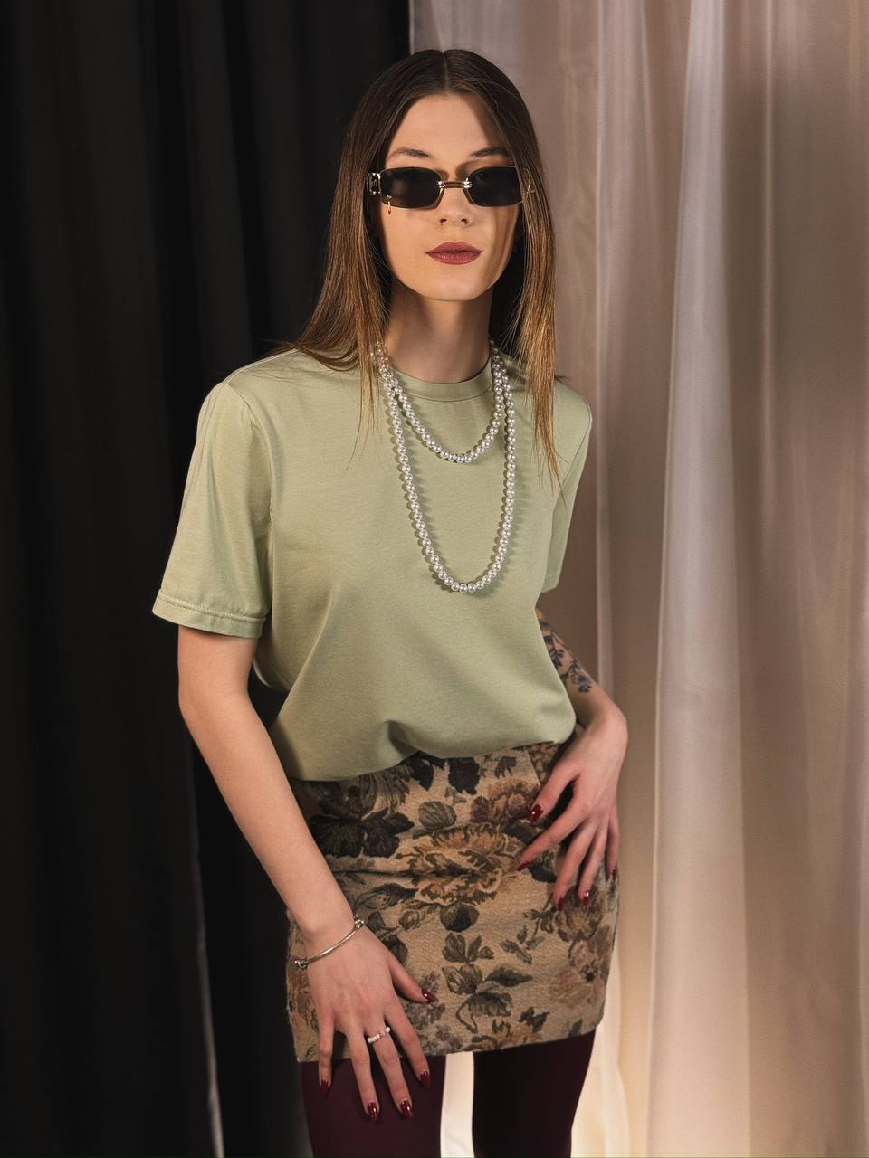 Гобеленовая юбка — акцентная вещь, поэтому верх должен быть более сдержанным: